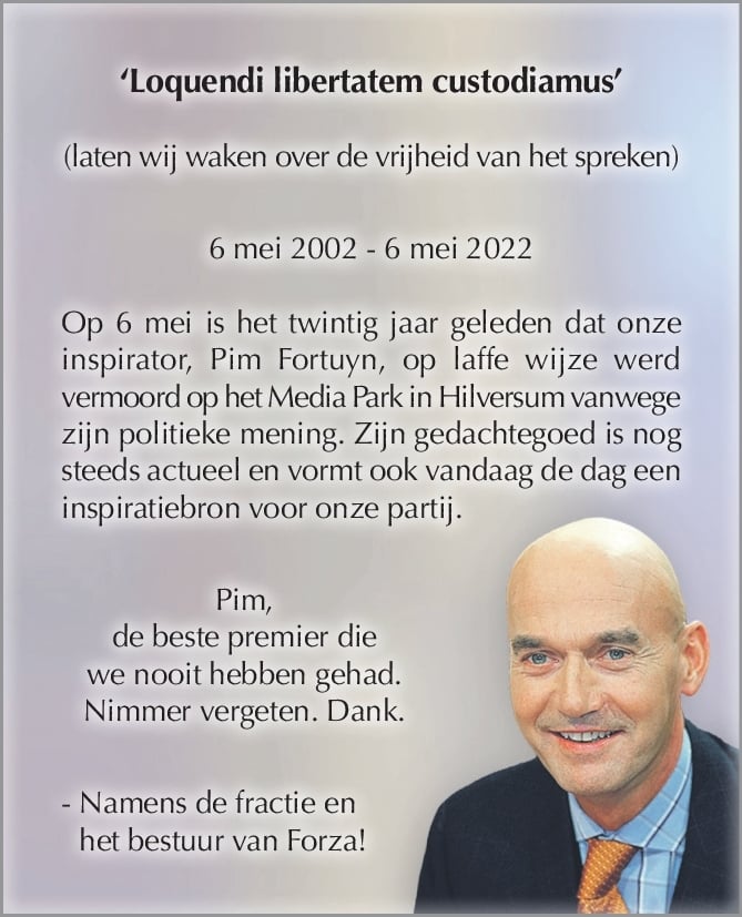 Op vrijdag 6 mei, is het precies 20 jaar geleden dat onze inspirator Pim Fortuyn werd vermoord in Hilversum vanwege zijn idealen en zijn mening. Zijn gedachtegoed is nog steeds springlevend bij Forza!. Nog steeds laat Forza! zich bij al haar besluiten inspireren door de 9 kernwaarden van Fortuyn. Voor Forza! is Pim nimmer vergeten.