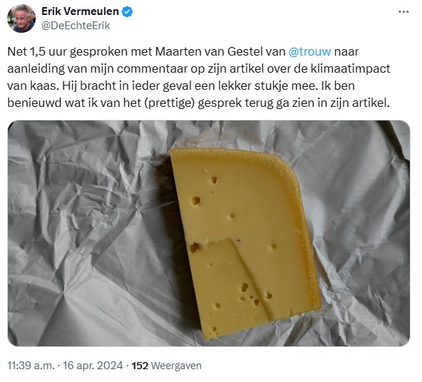 Is hij boos over het kaas-artikel omdat hij niet in door mensen veroorzaakte klimaatverandering gelooft? Of wil de individualistische Vermeulen zijn eigen manier van leven gewoon uit principe niet aanpassen aan een collectief belang? Het eerste, verzekert Vermeulen me. Maar, voegt hij snel toe, “ik vind het eigenlijk niet eens belangrijk of het klimaatverhaal onzin is of niet. De aarde is er al miljarden jaren. Of er nou mensen zijn, de aarde zal er over een paar miljard jaar nog zijn.”