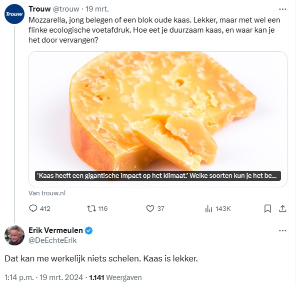 Het gehele artikel met alle interviews is terug te lezen in de Trouw van 25 mei en op de website van Trouw: Hoezo minder kaas eten? Deze Nederlanders zijn helemaal klaar met klimaatbetutteling | Trouw