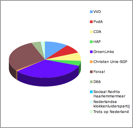 De schaduwverkiezing op het HVC was een succes! Jullie hebben alle fractieleden van de 10 aanwezige partijen flink aan de tand gevoeld! Vragen over opgevoerde scooters, hangplekken en overlast, nachtbus en de coffeeshop in Nieuw-Vennep vlogen door de aula. Na het debat gingen jullie stemmen. MENES geeft nu de uitslag…GroenLinks is de grote winnaar: 33% van de 151 scholieren heeft gestemd op deze partij! FORZA volgde met 29% van de stemmen. GroenLinks wil zich inzetten voor een goede busverbinding en vooral ’s nacht, dat jullie weer veilig thuis komen na het stappen. FORZA vindt dat de maximum snelheid voor het rijden van een scooter niet te streng hoeft aangepakt.De rest stemden op de VVD met 10,6%, PvdA 7,9%, CDA 7,3%, HAP 4,6%, Christen Unie/SGP 0,7%, D66 4%, Sociaal Rechts Haarlemmermeer 0%, Nederlandse Klokkenluiderspartij 1,3% en voor Trots op Nederland 0,7%.De gemeenteraad Haarlemmermeer heeft 39 zetels, op basis van jullie stemmen zou de verdeling zijn: GroenLinks 13 zetels, FORZA 11 zetels, VVD 4 zetels, PvdA 3 zetels, CDA 3 zetels, HAP 2 zetels, D66 2 zetels, Nederlandse Klokkenluiderspartij 1 zetel. De andere partijen krijgen geen zetel in de gemeente